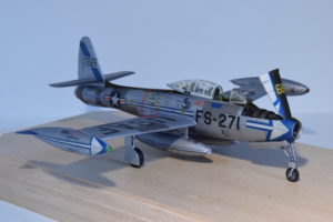 Le Republic F-84G Thunderjet est un chasseur-bombardier à réaction construit à la fin des années 1940 à plus de 7 000 exemplaires. Initialement destiné à l’USAF, il a été fourni en grandes quantités aux forces aériennes des pays de l’OTAN, dans le cadre du Military Assistance Program (MAP). À partir du modèle de base, doté d’une aile droite et d’une entrée d’air frontale, deux versions très différentes ont été conçues : le F-84F Thunderstreak avec des ailes en flèche, et le RF-84F Thunderflash de reconnaissance avec des ailes en flèche, un nez fermé contenant des caméras, et des entrées d’air déplacées à la racine des ailes.