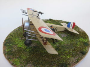 Le Nieuport 25 de Charles Nungesser, lorsqu’il servait encore à la V116. Nungesser fût mortifié le jour ou il a du abattre un Anglais trop zélé qui s’en était pris à lui. Il raconta plus tard avoir remué son appareil dans tous les sens possibles pour bien montrer ses cocardes a ce novice nerveux de la gâchette. Rien n’y a fait. L’anglais pugnace ne voulant rien savoir, il a du se retourner pour le faire taire. Le talent et l’expérience ont vite arbitré le match (si on peut dire), mais l’anglais y a perdu la vie. Une victoire dont il se serait bien passé et qui est officiellement passée sous silence, bien sûr. Jurant qu’on ne l’y reprendrait plus; il a demandé à son mécano de mettre des bandes tricolores partout sur ses machines. Elles en ont toutes porté depuis. Celle ci est l’une de ses plus barbouillées, il l’a utilisée peu de temps après le fâcheux incident.