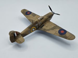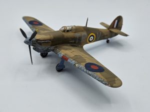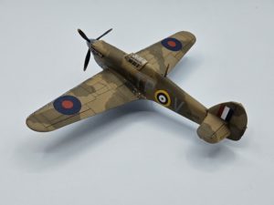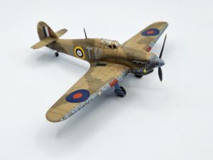 Le hurricane codé AS990 est arrivé par bateau au port de Takoradi au Ghana,où les Anglais avait un grand centre d’entretien des avions, et convoyé pendant 5 jours à travers l’Afrique . Arrivé avec son camouflage européen , il a été repeint couleur désert mais l’installation du filtre anti sable VOKES a nécessité une retouche de peinture à l’avant de l’avion avec une libre expression des mécaniciens de Abu Suwayr en Egypte: Appelé camouflage « Spaghetti nose »